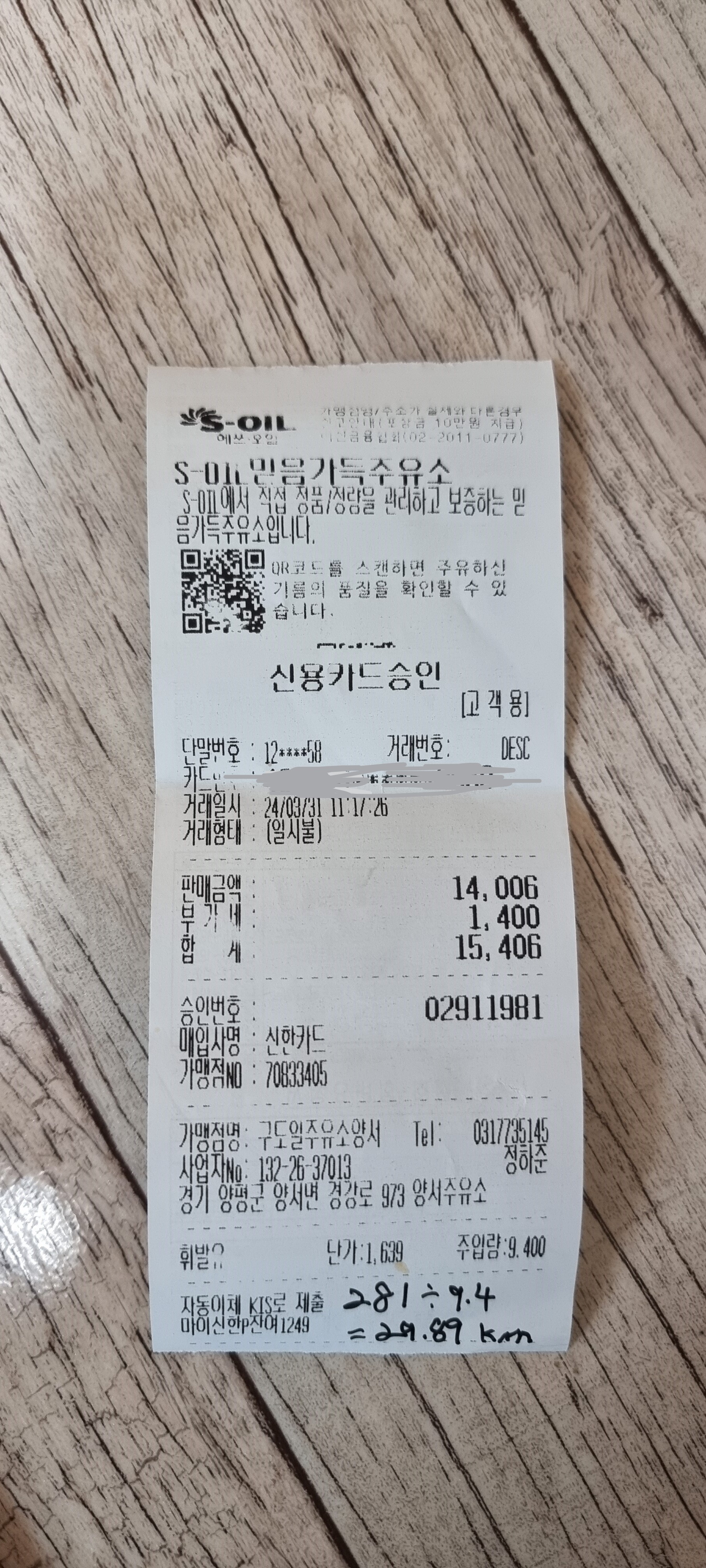그리고 가득주유..... 주유량 9.4L